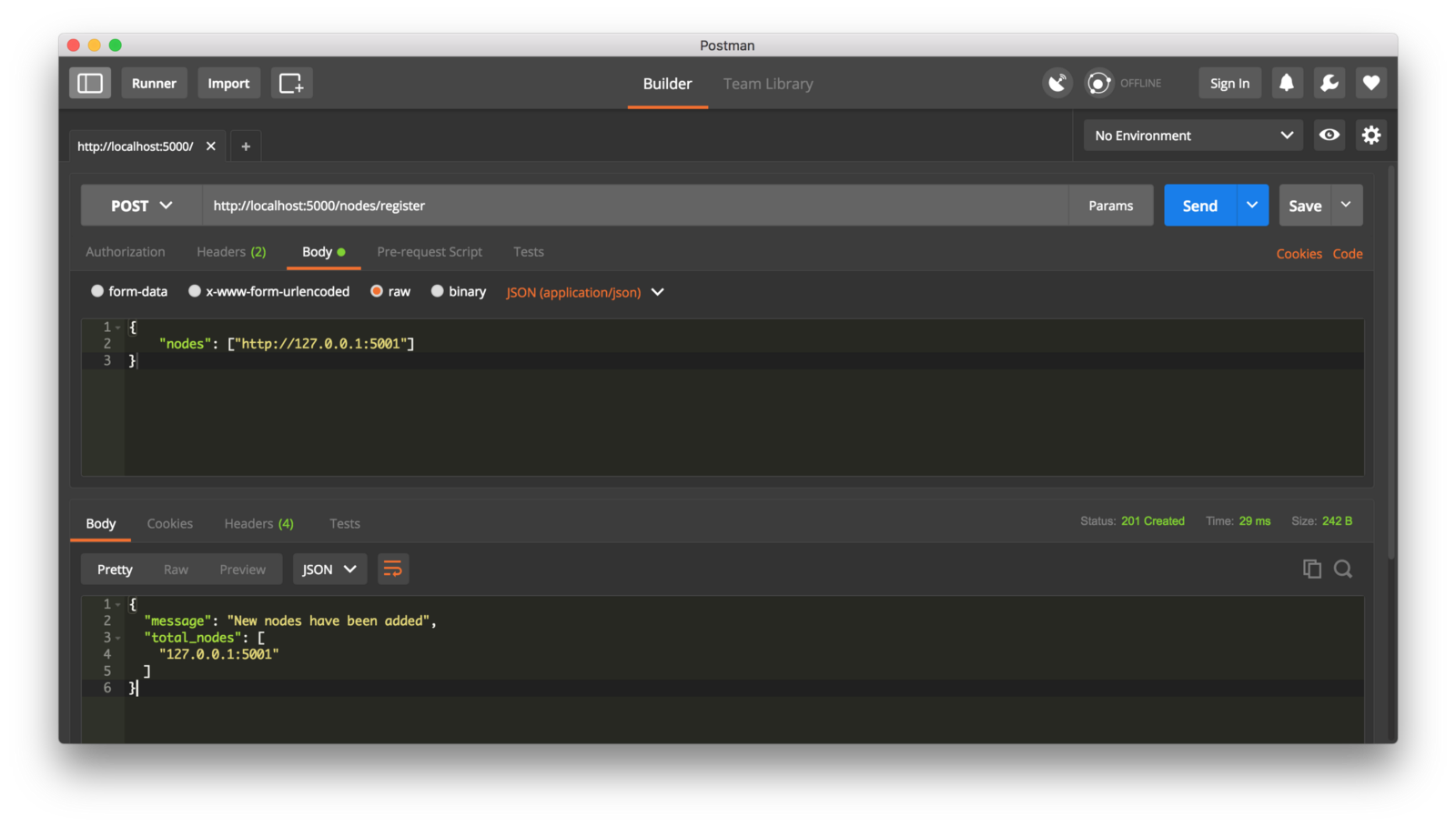 你可以在不同的机器运行节点,或在一台机机开启不同的网络端口来模拟多节点的网络,这里在同一台机器开启不同的端口演示,在不同的终端运行一下命令,就启动了两个节点:http://localhost:5000 和 http://localhost:5001
