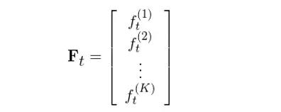 在介绍协方差矩阵的 Newey-West 调整前,我们首先看看当因子收益率在时序上没有相关性时的做法(通常的做法)。为了简化数学表达,在下面的推导中,假设收益率已经去均值化(demean)了。假设共有 K 个因子,令 F_t 表示第 t 期这 K 个因子的收益率向量,它是一个 K × 1 向量:
