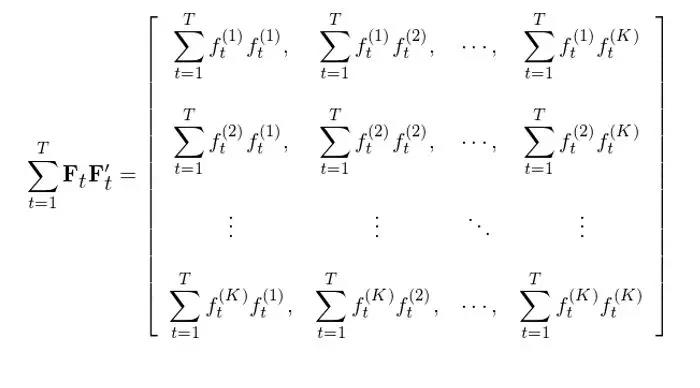 假设计算协方差矩阵的时间窗口为 T,即 t 的取值为 1 到 T。对 T 窗口内的所有 t 都进行上述运算并把不同 t 的 F_tF_t’ 相加得到 ΣF_tF_t’: