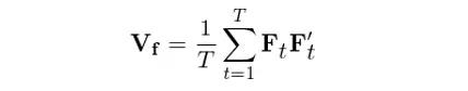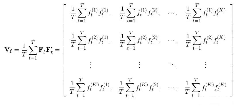 在接下来的行文中,我们只要记住:F_t 是一个 K × 1 的列向量,代表第 t 期 K 个因子的收益率向量(demean 之后的收益率);而通过总共 T 期(sample size)的 F_t, t = 1, 2, …, T 计算出来的因子收益率协方差矩阵 V_f 为(请记住这个式子,下面讲 Newey-West 调整时还会用到):