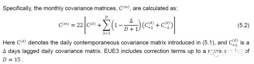 这就是 Barra 采用的 Newey-West 调整。在 Barra 的 EUE3 研究报告(Briner et al. 2009)中的第五节对此有简单的说明。此外,前文提到,Barra 需要用日频的协方差矩阵通过 scaling 转换成月频的。为此,Barra 的做法是对 Newey-West 调整后的日频协方差矩阵乘以一个月内的交易天数,即 22,这就得到了最终的因子收益率协方差矩阵(下图截自 Briner et al. 2009,在 EUE3 中 Barra 采用的最大滞后期为 15)。
