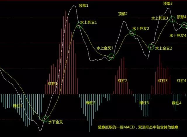 MACD形态跟K线形态差不多,大概为:双顶,双底,头肩底,头肩颈,顶背离,底背离,水上金叉,水下金叉等,其实仔细观察发现他们都是双底和双顶的衍生,那咱们着重阐述MACD双顶双底形态。为了更加直观,咱们还是从裸M图来观察。