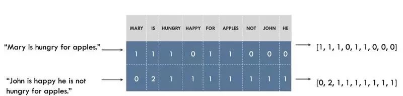 例如,我们可以为数据集中的所有单词制作一张词表,然后将每个单词和一个唯一的索引关联。每个句子都是由一串数字组成,这串数字是词表中的**单词对应的个数。通过列表中的索引,我们可以统计出句子中某个单词出现的次数。这种方法叫做 词袋模型,它完全忽略了句子中单词的顺序。如下图所示: