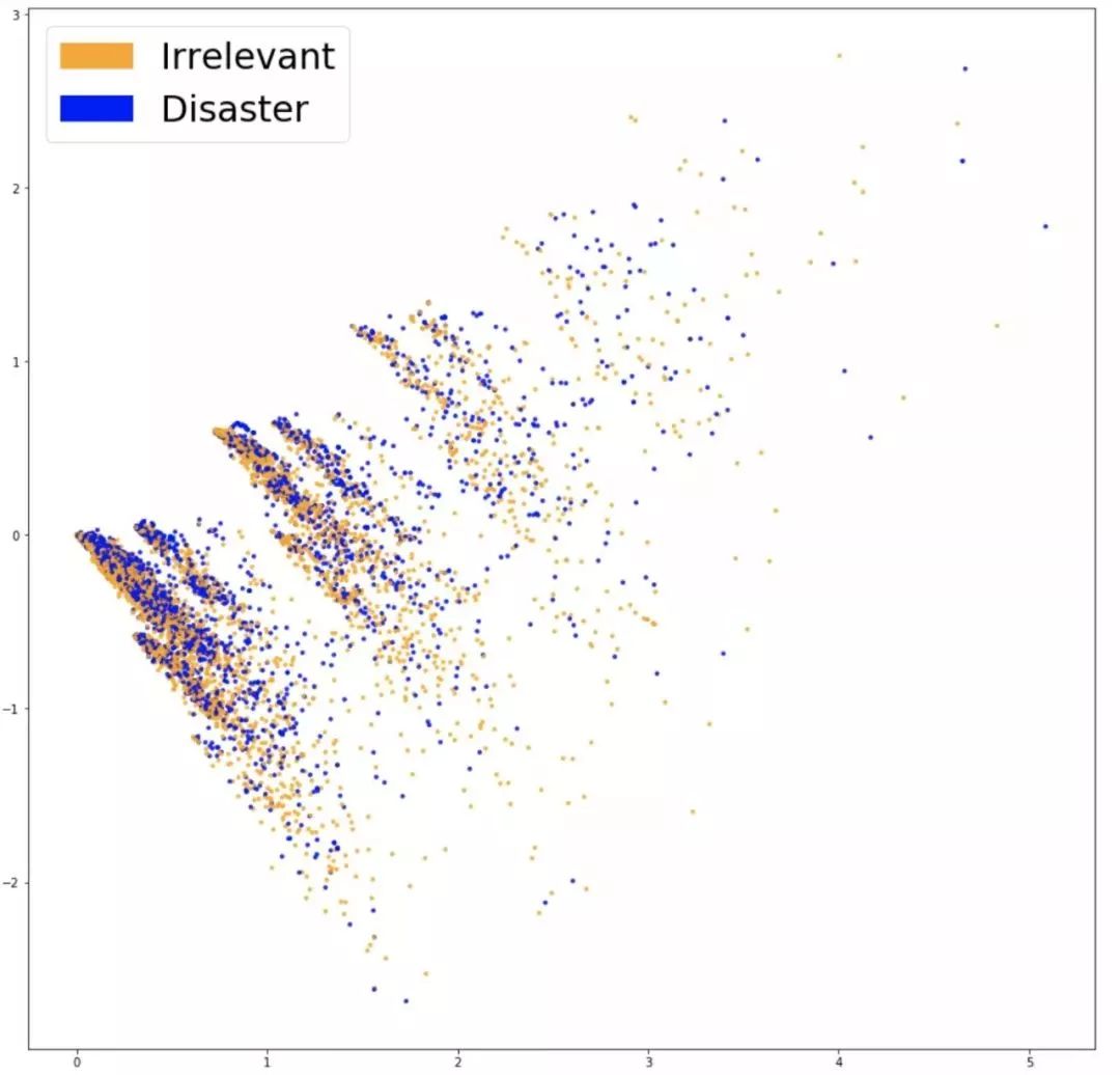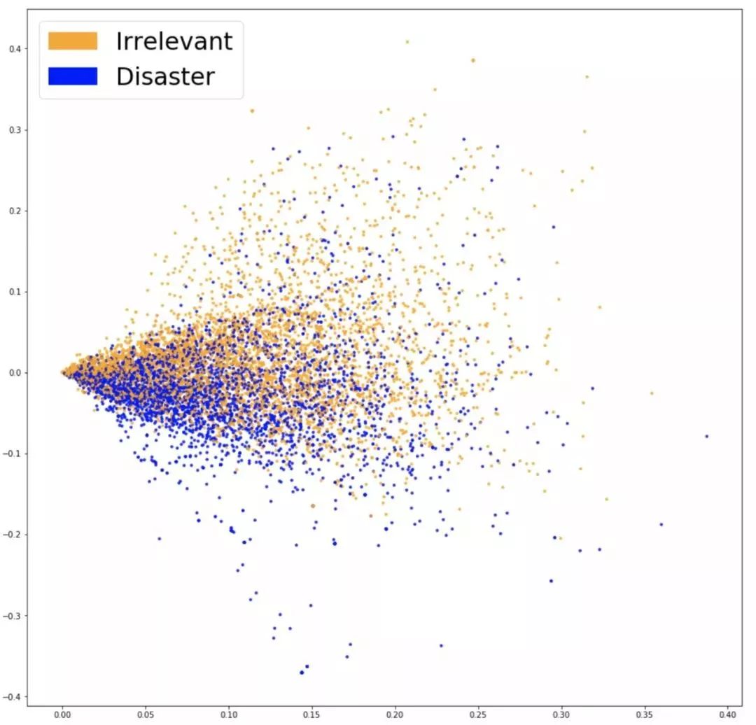 为了看出嵌入的工作是否真正抓住了和问题相关的信息(比如推文是否与灾难相关),有一个好方法是将它们可视化,然后观察结果是否有很好的分布。考虑到词表通常很大,而且用 20000 维的数据做可视化是基本不可能的,所以我们使用了 PCA 这种技术将数据降到二维。绘制如下: