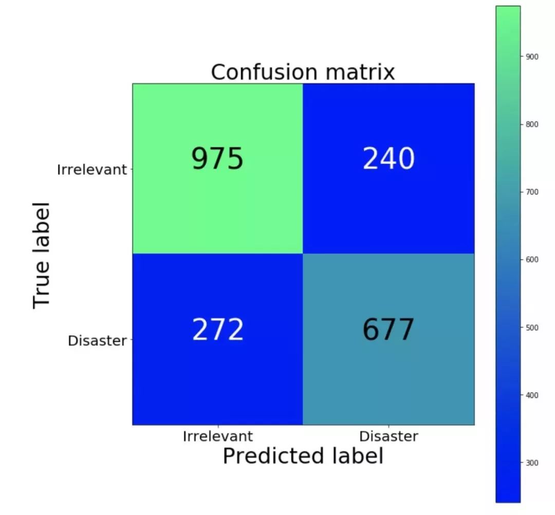 相比假阳性结果,我们的分类器产生了更多的假阴性结果。换句话说,模型中最常见的错误是将灾难性推文错误归类为不相关推文。如果假阳性结果的执法成本很高的话,那么我们分类器的这种偏差就是良性的。