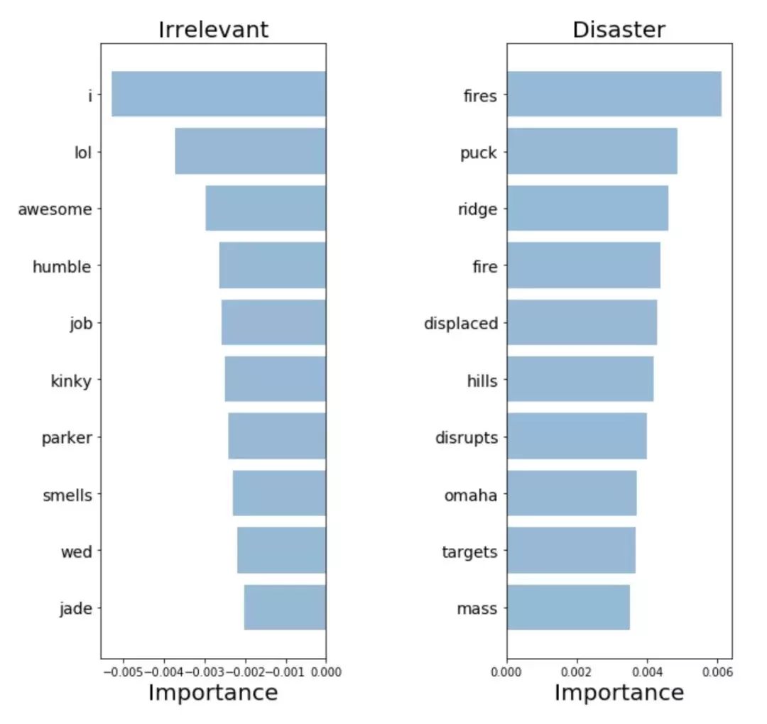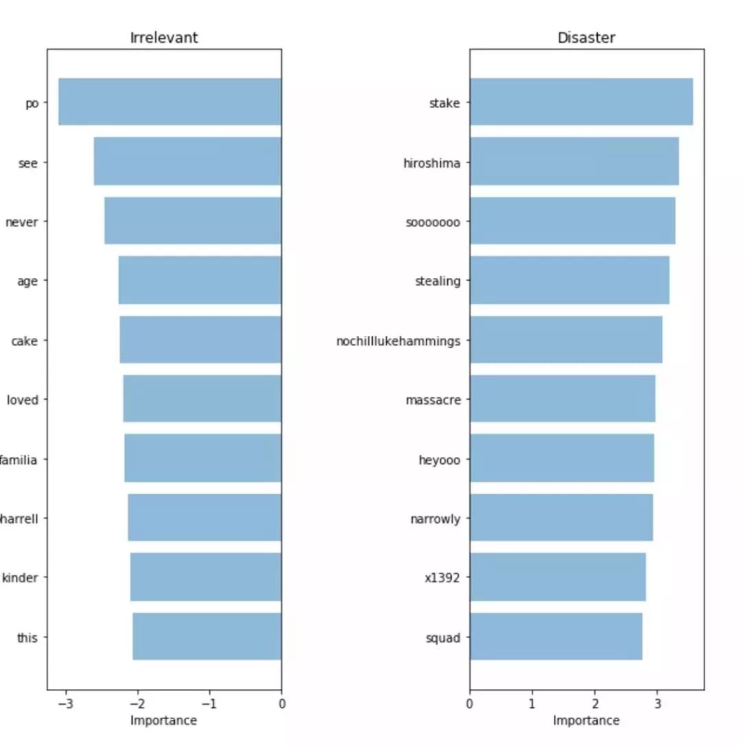 在这里,我们可以用图表来表示灾难性推文与不相关推文两类预测中最重要的词汇。由于我们可以对模型的预测系数进行提取和排序,用词袋模型(bag-of-words)和Logistic回归模型很容易就能计算出单词的重要性。