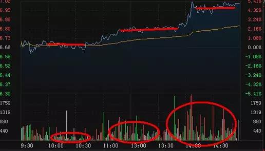 如下面的分时图和K线走势,股价平开后在均价线附近运行,形成一个震荡平台,然后拉升脱离均价线构筑第二个震荡平台,分时量能明显放大,尾盘出现一波拉升形成第三个高位平台,量能进一步放大。