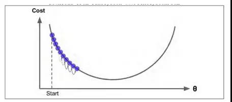 在梯度下降中一个重要的参数是步长,超参数学习率的值决定了步长的大小。如果学习率太小,必须经过多次迭代,算法才能收敛,这是非常耗时的(如图 4-4)。