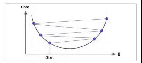 另一方面,如果学习率太大,你将跳过最低点,到达山谷的另一面,可能下一次的值比上一次还要大。这可能使的算法是发散的,函数值变得越来越大,永远不可能找到一个好的答案(如图 4-5)。
