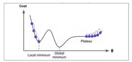 最后,并不是所有的损失函数看起来都像一个规则的碗。它们可能是洞,山脊,高原和各种不规则的地形,使它们收敛到最小值非常的困难。 图 4-6 显示了梯度下降的两个主要挑战:如果随机初始值选在了图像的左侧,则它将收敛到局部最小值,这个值要比全局最小值要大。 如果它从右侧开始,那么跨越高原将需要很长时间,如果你早早地结束训练,你将永远到不了全局最小值。