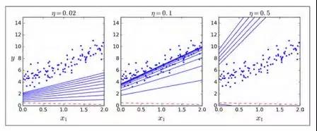 看!正态方程的表现非常好。完美地求出了梯度下降的参数。但是当你换一个学习率会发生什么?图 4-8 展示了使用了三个不同的学习率进行梯度下降的前 10 步运算(虚线代表起始位置)。