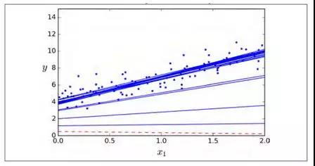 批量梯度下降的最要问题是计算每一步的梯度时都需要使用整个训练集,这导致在规模较大的数据集上,其会变得非常的慢。与其完全相反的随机梯度下降,在每一步的梯度计算上只随机选取训练集中的一个样本。很明显,由于每一次的操作都使用了非常少的数据,这样使得算法变得非常快。由于每一次迭代,只需要在内存中有一个实例,这使随机梯度算法可以在大规模训练集上使用。