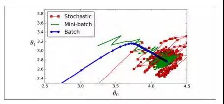 小批量梯度下降在参数空间上的表现比随机梯度下降要好的多,尤其在有大量的小型实例集时。作为结果,小批量梯度下降会比随机梯度更靠近最小值。但是,另一方面,它有可能陷在局部最小值中(在遇到局部最小值问题的情况下,和我们之前看到的线性回归不一样)。 图4-11显示了训练期间三种梯度下降算法在参数空间中所采用的路径。 他们都接近最小值,但批量梯度的路径最后停在了最小值,而随机梯度和小批量梯度最后都在最小值附近摆动。 但是,不要忘记,批次梯度需要花费大量时间来完成每一步,但是,如果你使用了一个较好的learning schedule,随机梯度和小批量梯度也可以得到最小值。