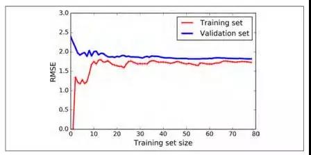 这幅图值得我们深究。首先,我们观察训练集的表现:当训练集只有一两个样本的时候,模型能够非常好的拟合它们,这也是为什么曲线是从零开始的原因。但是当加入了一些新的样本的时候,训练集上的拟合程度变得难以接受,出现这种情况有两个原因,一是因为数据中含有噪声,另一个是数据根本不是线性的。因此随着数据规模的增大,误差也会一直增大,直到达到高原地带并趋于稳定,在之后,继续加入新的样本,模型的平均误差不会变得更好或者更差。我们继续来看模型在验证集上的表现,当以非常少的样本去训练时,模型不能恰当的泛化,也就是为什么验证误差一开始是非常大的。当训练样本变多的到时候,模型学习的东西变多,验证误差开始缓慢的下降。但是一条直线不可能很好的拟合这些数据,因此最后误差会到达在一个高原地带并趋于稳定,最后和训练集的曲线非常接近。