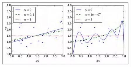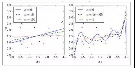 岭回归(也称为 Tikhonov 正则化)是线性回归的正则化版:在损失函数上直接加上一个正则项 $\alpha\sum_{i=1}^n\theta_i^2$。这使得学习算法不仅能够拟合数据,而且能够使模型的参数权重尽量的小。注意到这个正则项只有在训练过程中才会被加到损失函数。当得到完成训练的模型后,我们应该使用没有正则化的测量方法去评价模型的表现。
