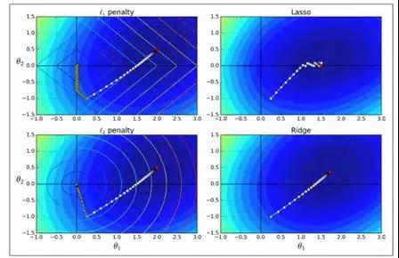 你可以从图 4-19 知道为什么会出现这种情况:在左上角图中,后背景的等高线(椭圆)表示了没有正则化的均方差损失函数($\alpha=0$),白色的小圆圈表示在当前损失函数上批量梯度下降的路径。前背景的等高线(菱形)表示$\ell_1$惩罚,黄色的三角形表示了仅在这个惩罚下批量梯度下降的路径($\alpha\rightarrow\infty$)。注意路径第一次是如何到达 $\theta_1=0$,然后向下滚动直到它到达 $\theta_2=0$。在右上角图中,等高线表示的是相同损失函数再加上一个 $\alpha=0.5$ 的 $\ell_1$ 惩罚。这幅图中,它的全局最小值在 $\theta_2=0$ 这根轴上。批量梯度下降首先到达 $\theta_2=0$,然后向下滚动直到达到全局最小值。 两个底部图显示了相同的情况,只是使用了 $\ell_2$ 惩罚。 规则化的最小值比非规范化的最小值更接近于 $\theta=0$,但权重不能完全消除。