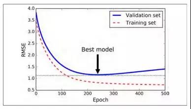 对于迭代学习算法,有一种非常特殊的正则化方法,就像梯度下降在验证错误达到最小值时立即停止训练那样。我们称为早期停止法。图 4-20 表示使用批量梯度下降来训练一个非常复杂的模型(一个高阶多项式回归模型)。随着训练的进行,算法一直学习,它在训练集上的预测误差(RMSE)自然而然的下降。然而一段时间后,验证误差停止下降,并开始上升。这意味着模型在训练集上开始出现过拟合。一旦验证错误达到最小值,便提早停止训练。这种简单有效的正则化方法被 Geoffrey Hinton 称为“完美的免费午餐”
