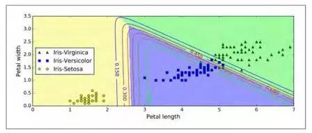 图 4-25 用不同背景色表示了结果的决策边界。注意,任何两个类之间的决策边界是线性的。 该图的曲线表示 Versicolor 类的概率(例如,用 0.450 标记的曲线表示 45% 的概率边界)。注意模型也可以预测一个概率低于 50% 的类。 例如,在所有决策边界相遇的地方,所有类的估计概率相等,分别为 33%。