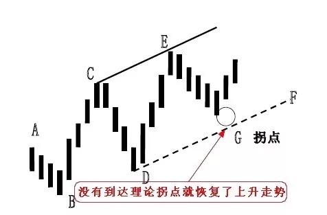 市场并没有到达理论拐点就恢复了上升走势,请记住,拐点只是我们计算的理论值,有时不到理论值就恢复之前的走势,有时有可能穿越理论拐点,判断是否穿越拐点线的工具是K 线反转理论。