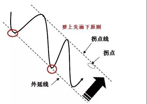 在上升趋势中,要想找到价位向上恢复上升的理论目标(拐点),按照“要找上,先画下”的原则,首先在上升通道的下边找出通道的外延线,将外延线平移后得到拐点线,就可以确立恢复上升的理论拐点的位置。(如下图)
