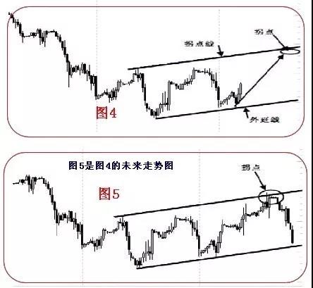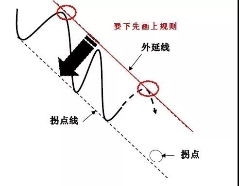 在下降趋势中,要想找到价位向下恢复下跌的理论目标(拐点),按照“要找下,先画上”的原则,首先在下降通道的上边找出通道的外延线,将外延线平移后得到拐点线,就可以确立下跌的理论拐点的位置(如下图)。