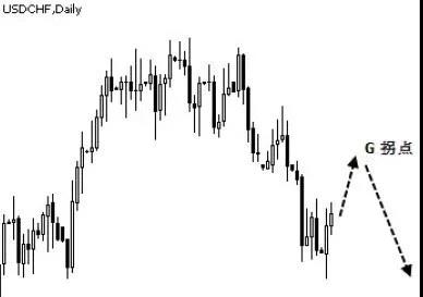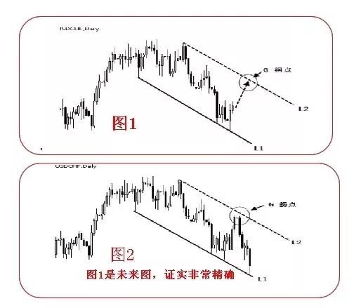 上图是美元兑瑞士法郎日线图。由K 线反转形态我们知道价位已经形成短暂底部,市场将展开回调走势,之后再恢复下跌。现在我们就要通过寻找拐点,来确定市场恢复下跌的转折点。要想找到下降趋势中上边的拐点,按照“要找上,先画下”的原则,首先找出下边的最外延的线L1,将外延线L1 平行移动至上边外延得到平行线L2,未来价格即将与L2 相交的点,就是未来的拐点(如下图1)。