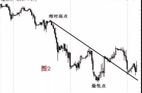 上图1是道琼斯股票指数期货合约走势图,以它为例。首先我们将下降趋势线找出。连接最高点(或相对高点)与最低点之前任意高点的连线,中间不穿越任何价位的直线,就是我们要找的下降趋势线。如图2 所示: