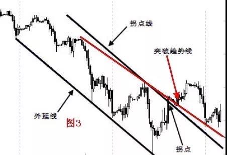 由定义可知,突破下降趋势线,之前的下降趋势已经或即将结束。判断下降趋势已经结束的依据是价格同时升破了拐点,请大家思考拐点线的画法。要想找到下降趋势上边的拐点,按照“要找上,先画下”的原则,首先找到下降趋势的外延线(图3)。将外延线平行移动至最低点之前的第一个高点,得到拐点线。