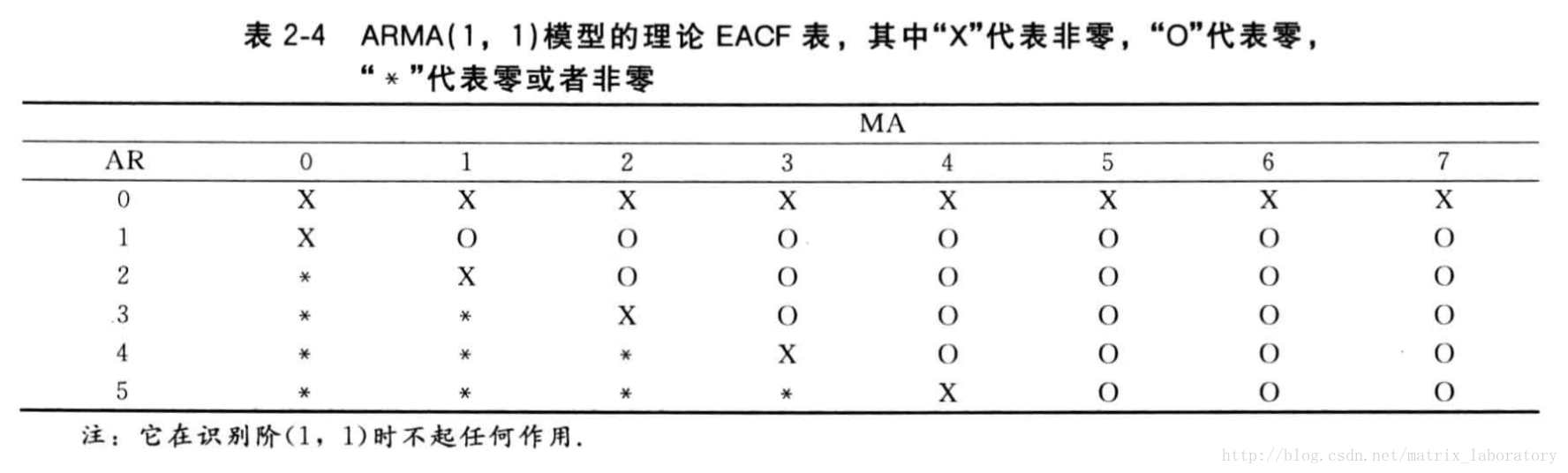 一般地,ARMA(p,q)模型的p,q是由EACF表中“O”组成的三角形的左上定点位置决定。