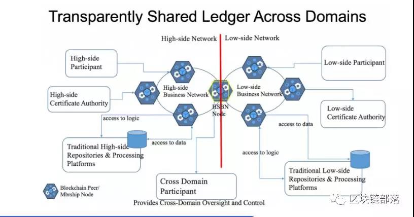 在区块链网络中,跨域保护的角色将由高安全性平台(称为高安全业务节点(HSBN))上安装的区块链网络对等执行。 分布式跨域区块链商业网络内的数据移动采取加密保护的事务更新的形式到由业务网络的特定成员专用信道中的每个节点持有的共享分类帐。区块链商业网络的其他对等节点驻留在一个或另一个安全区域,不管是高还是低,接收被批准的分类账交易的保护区块。 签署的分类账更新通过边界HSBN发生在对面的安全域上,以保证区块链提供的安全控制不能被绕过或覆盖。