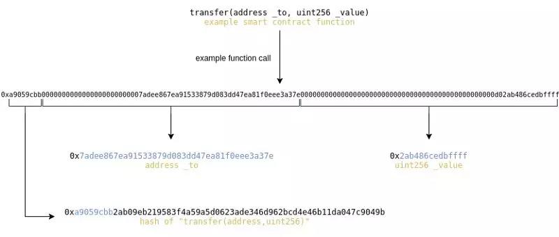 为了知道调用的是哪个函数,必须提前知道合约的所有的函数,才能创建哈希表。前 32 位 a9059cbb 是函数哈希的前 32 位。在当前情况下,函数为 transfer(address _to, uint256 _value) ,它的哈希为: