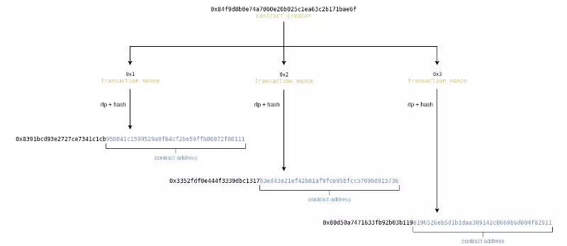 合约地址是发送者地址哈希值的后 160 位,而且 nonce 可以提前确定。对于这个交易来说,发送者和 nonce 可以在下列代码中发现: