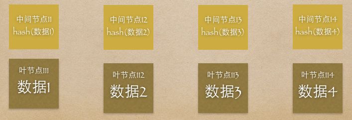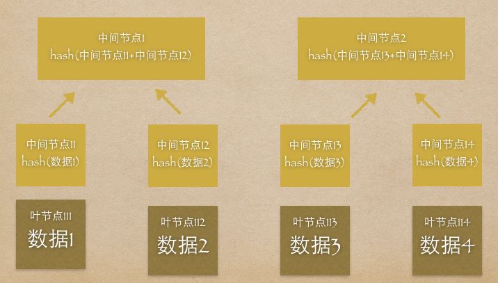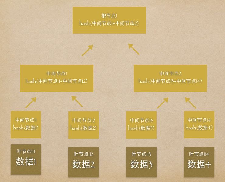 默克尔树,又叫哈希树,是一种树的数据结构,由一个根节点、一组中间节点和一组叶节点组成。最下面的叶节点包含存储数据或其哈希值,其上的节点是它的子节点内容的哈希值。一个默克树的生成过程如下: