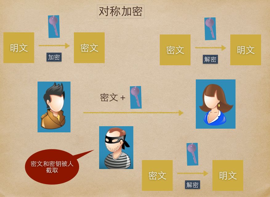 如果有人在传输过程中截取了密文和密钥,就一样能解密出明文,这就导致了安全性问题。