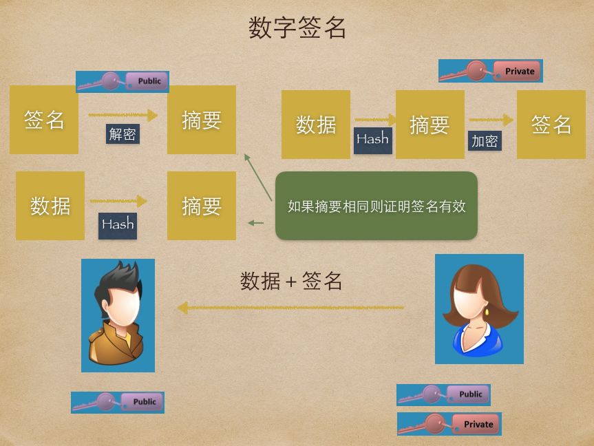 数字签名使用了公钥密码学。公钥密码学是非对称加密技术,其相对于对称加密技术。在对称加密技术中加密使用相同的密钥加解密数据,为了让对方能够解密,需要同时将密文和密钥发给对方。