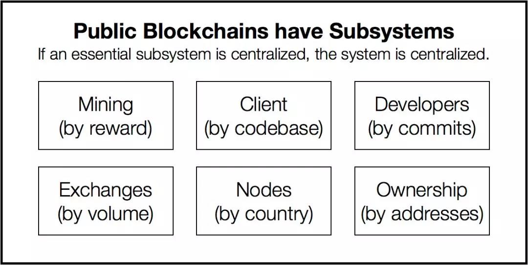 为了将这个概念应用到公有链领域,我们需要对去中心化系统和去中心化子系统加以区别。具体来说,去中心化系统(比如比特币)由一系列去中心化子系统(比如挖矿、交易所、节点、开发人员、客户端等等)组成。以下为组成比特币的六个子系统: