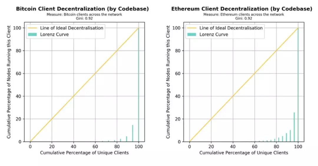 如每个图表顶部中间位置的面板所示,大多数比特币用户使用 Bitcoin Core 客户端,而 Bitcoin Unlimited 则是第二大受欢迎的客户端。这意味着如按不同客户端代码库的数量来衡量的话,比特币中心化程度相当高(基尼系数=0.92)。对于以太坊来说,大多数(76%)客户端是 geth,另外有 16% 的客户端是 Parity,以太坊客户端代码库的基尼系数也达到了 0.92,这两个代码库占了大半个生态系统。