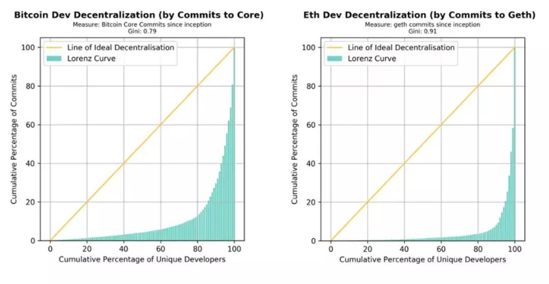 在右上角的面板中,我们可以发现 Bitcoin Core 客户端拥有大量为其做出代码贡献的工程师。尽管原始的提交数量对于贡献度来说无疑是一项不精确衡量标准,但这似乎还是表明相对少量的工程师群体为 Bitcoin Core 做了绝大部分工作。以太坊 geth 客户端的开发甚至更为集中化,只有两位开发人员贡献了代码。