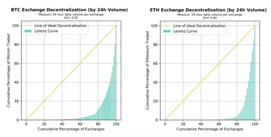 各个交易所比特币和以太坊的交易量差异很大,相应的基尼系数也是如此。然而,我们出于展示目的,在左下角的面板中计算了过去 24 小时的基尼系数快照。