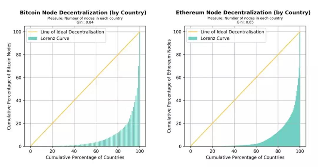 去中心化的另一个衡量标准(底部中间位置的面板)是确定比特币和以太坊的在不同国家的节点分布情况。
