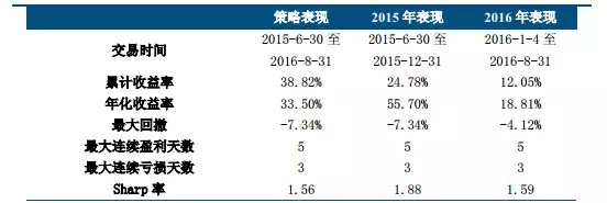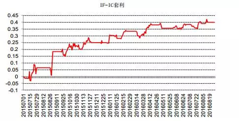 自2015年6月30日至2016年8月31日,IF与IC主力合约间的跨品种套利的年化收益为33.50%,其中,该策略在2015年(2015年6月30日至2015年12月31日)的年化收益达55.70%,最大回撤7.34%,2016年(2016年1月4日至2016年8月31日)的年化收益和最大回撤分别下滑至18.81%、4.12%。