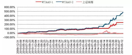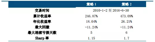 由上表可见,对于策略1,其年化收益达18.04%,最大回撤-11.24%;而由于2010年至2016年间伦敦金与WTI原油不协整时间所占比例相应较小,因此,当两者间不协整时,通过基于相对强弱指标的轮动策略可有效提高年化收益,同时,从Sharp率及收益回撤比的角度看,策略2亦具备一定优势。