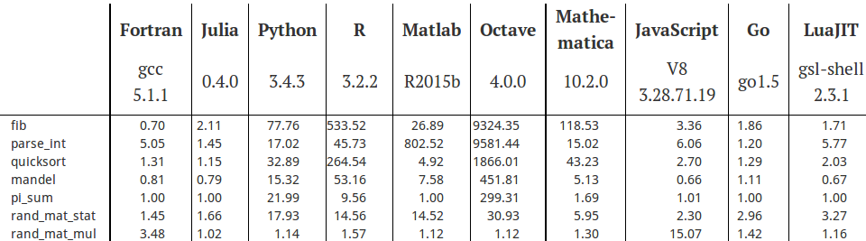 R,Octave,Matlab 和 Python 内置的发生器都是 MT 发生器,与之实现有关的数学库,也是 Blas,虽然有开源和进一步优化的商业版本之分,但是矩阵乘法,向量乘法之类运算的效率也就半斤八两,Julia 语言官网给出了一个标准测试2。