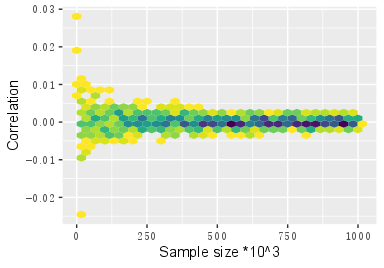 先来一个简单的,就用 R 产生的两个**同均匀分布样本,调用 cor.test 做相关性检验,看看这两组数是不是足够**同分布,通过眼球验证,随着样本量增大,相关性趋于 0,相关性弱到可以视为**。如下图所示