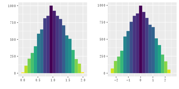 p5 <- ggplot(data.frame(x = sqrt(6)*(z-1)), aes(x, fill = ..count..)) +