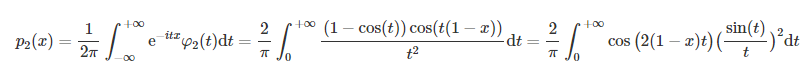integrate 2/pi*cos(2*t*(1-x))*(sin(t)/t)^2 ,t ,0,oo