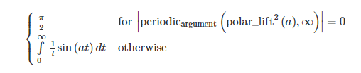 ## Piecewise((pi/2, Eq(Abs(periodic_argument(polar_lift(a)**2, oo)), 0)), (Integral(sin(a*t)/t, (t, 0, oo)), True))