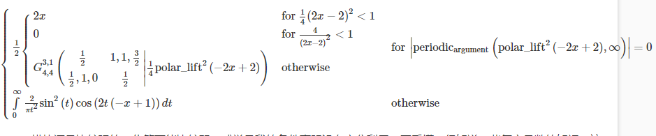 ## Piecewise((Piecewise((2*x, (2*x - 2)**2/4 < 1), (0, 4/(2*x - 2)**2 < 1), (meijerg(((1/2,), (1, 1, 3/2)), ((1/2, 1, 0), (1/2,)), polar_lift(-2*x + 2)**2/4), True))/2, Eq(Abs(periodic_argument(polar_lift(-2*x + 2)**2, oo)), 0)), (Integral(2*sin(t)**2*cos(2*t*(-x + 1))/(pi*t**2), (t, 0, oo)), True))