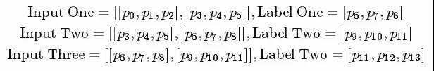 价格的顺序首先被分成不重叠的小窗口。 每个窗口都包含input_size数字,每个数字被视为一个**的输入元素。 然后,任何num_steps连续的输入元素被分配到一个训练输入中,形成一个训练在Tensorfow上的“unrolled”版本的RNN。 相应的标签就是它们后面的输入元素。例如,如果input_size = 3和num_steps = 2,我们的第一批的训练样例如下所示: