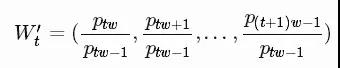 为了解决样本外的问题,我们在每个移动窗口中对价格进行了标准化。 任务变成预测相对变化率而不是绝对值。 在t时刻的标准化滑动窗口W't中,所有的值除以最后一个未知价格 Wt-1中的最后一个价格: